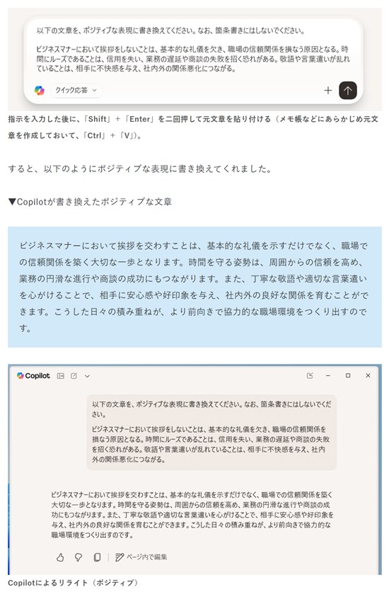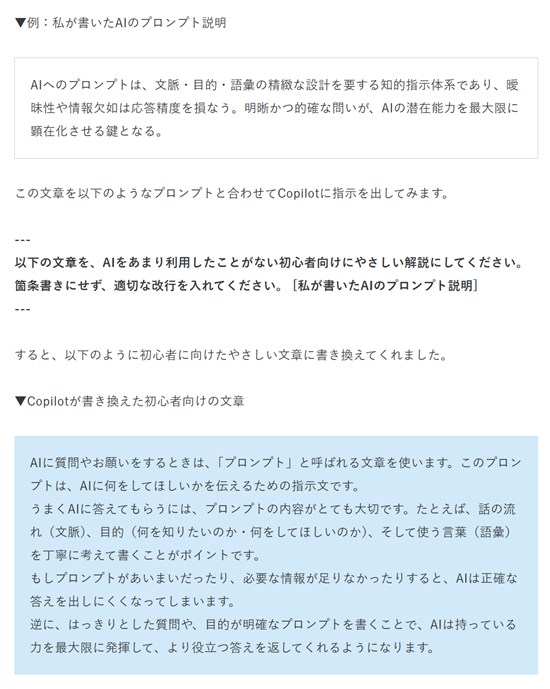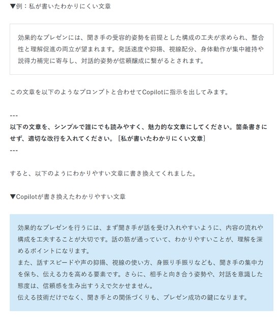 Copilotがどんなふうに文章を改善できるのかをわかりやすく解説しています。